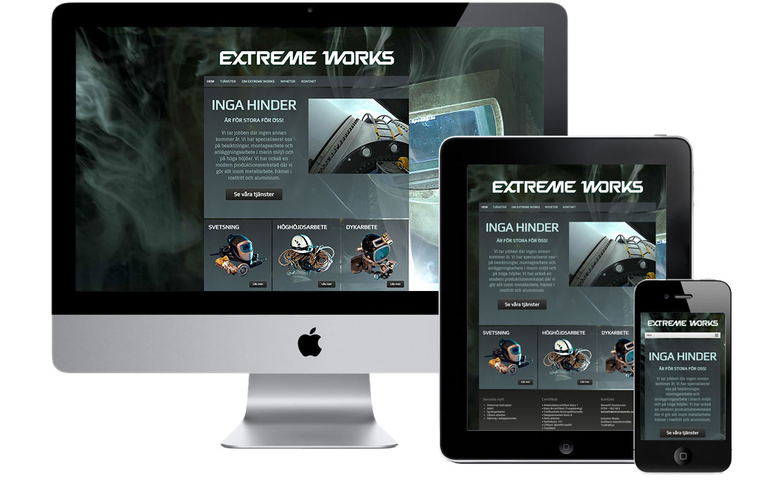 Extreme Works tar jobben där andra inte kommer åt – på höga höjder och i djupa vatten. Bolaget jobbar även med metallarbeten i aluminium och rostfritt. Uppdraget var att förnya företagsprofilen med design av logotyp, formspråk på bilder, grafiskt material, trycksaker och en ny responsiv hemsida, allt präglat med en rejäl portion attityd.